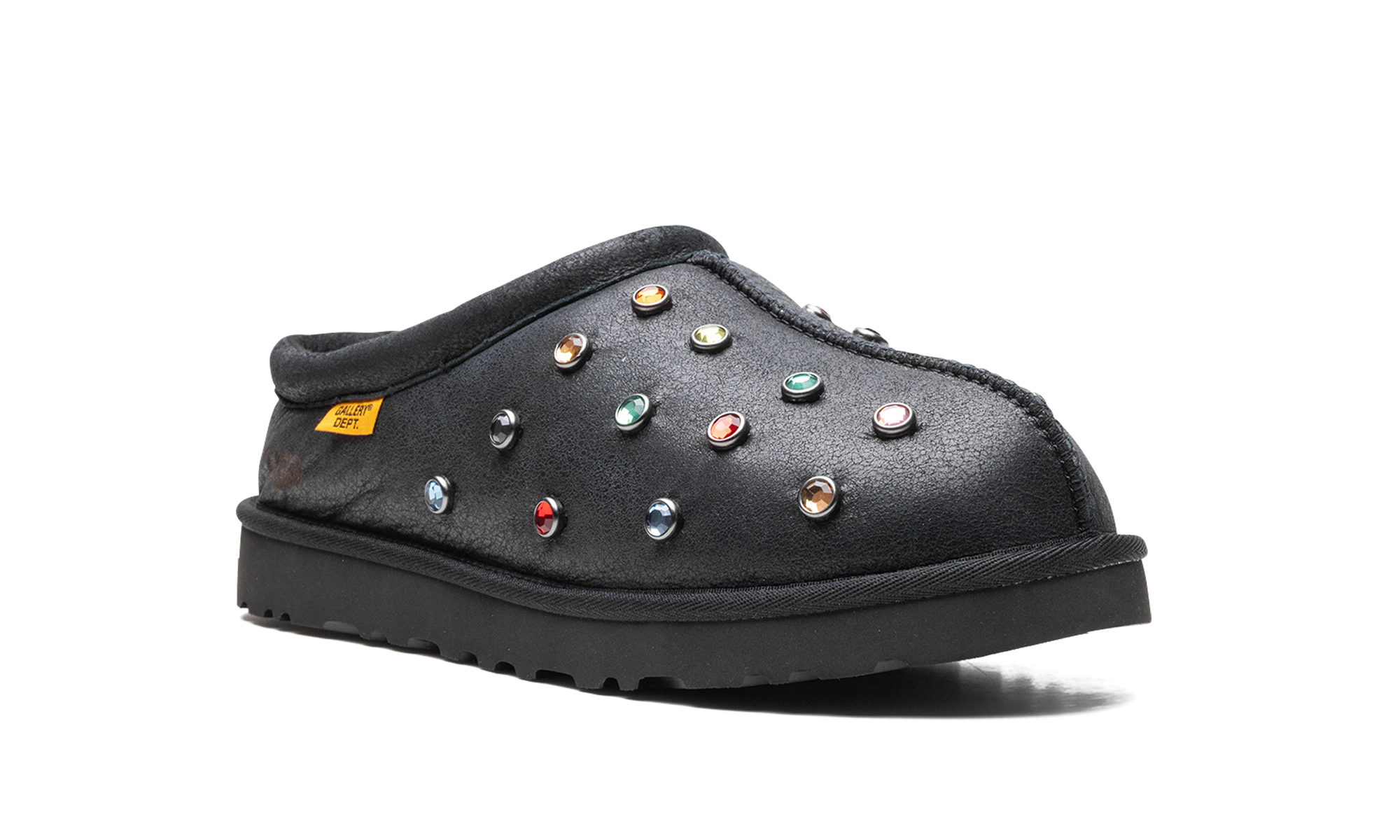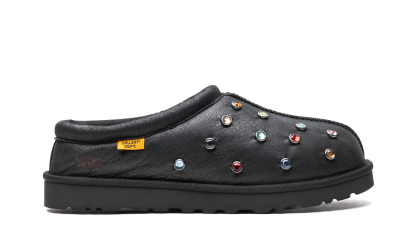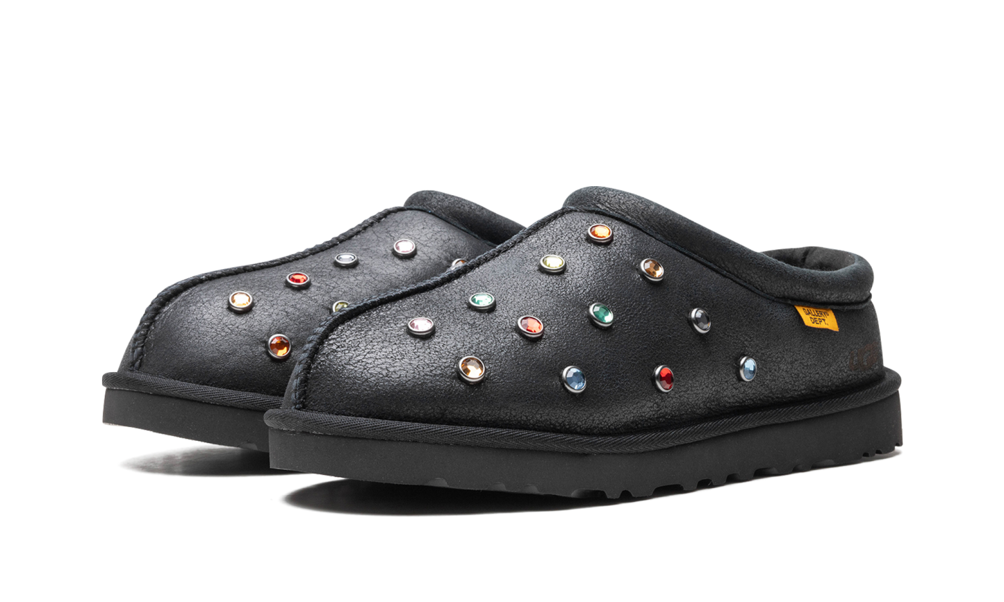 The Gallery Dept. x UGG Tasman Slipper “Black” is a collaboration by the Los Angeles based art and streetwear brand and UGG on the popular slip-on shoe. Gallery Dept.’s take on the UGG Tasman Slipper features an all-black leather upper embellished with multicolor metallic studs. The black inner lining is made with regenerative tablegrade and twinface sheepskin. A yellow “Gallery Dept.” hang tag appears on the lateral collar. Underfoot, a black rubber sole completes the look.