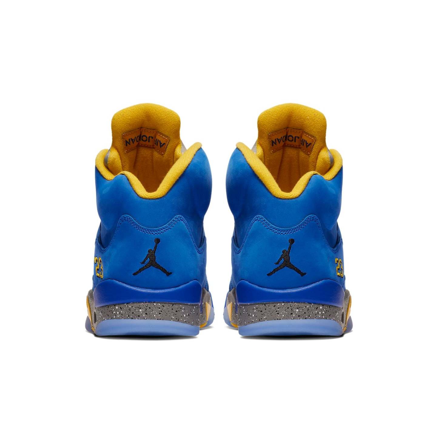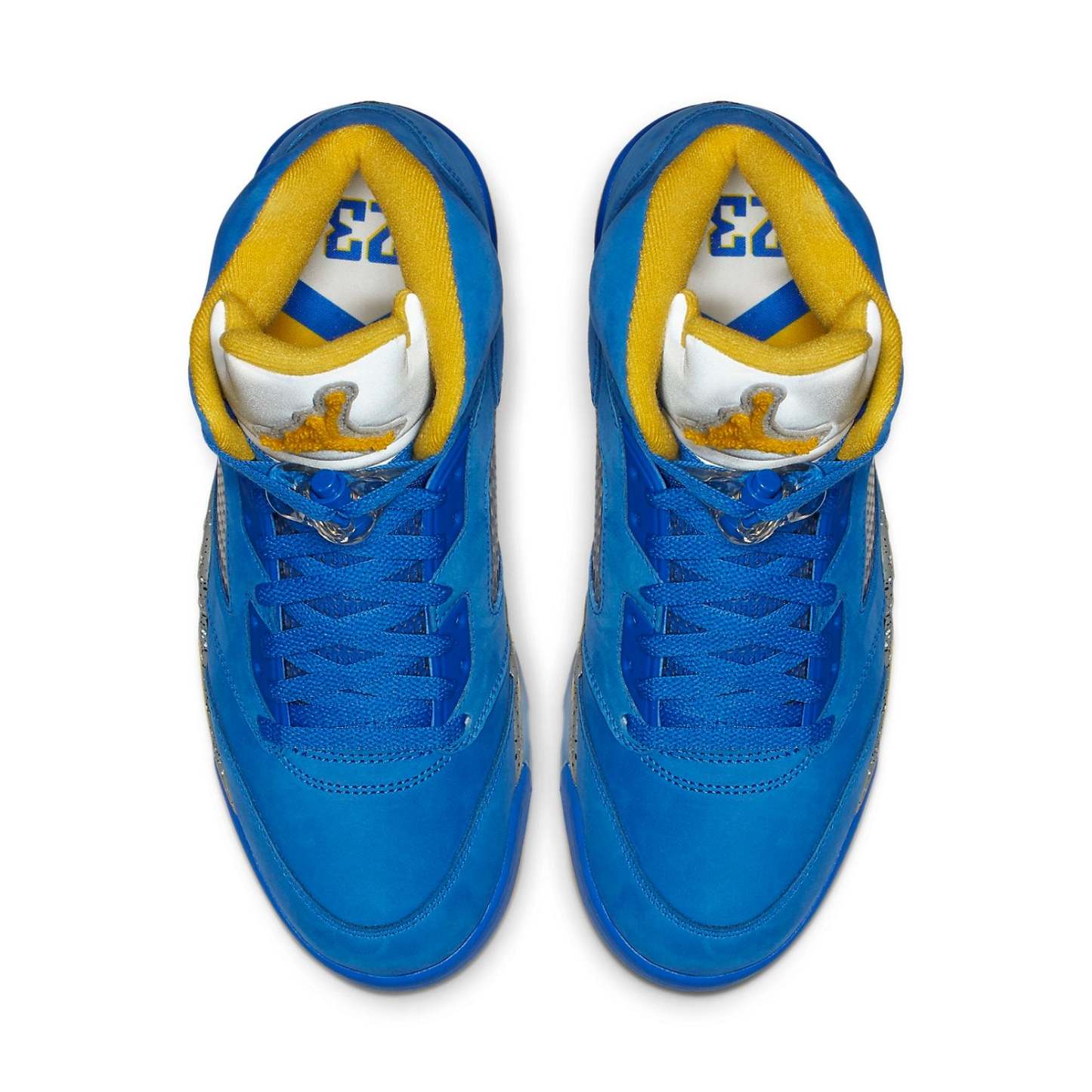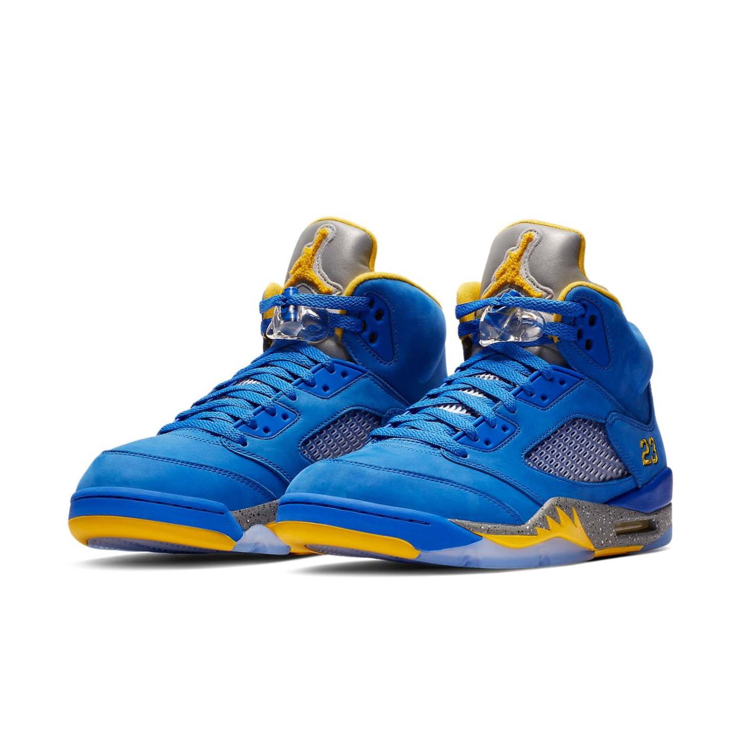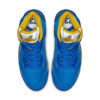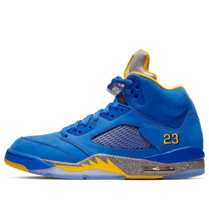 The Air Jordan 5 Laney JSP "Varsity Royal" comes dressed in a Varsity Royal/Light Charcoal-Varsity Maize color scheme. Details on this shoe include a Varsity Royal nubuck on the upper, Maize hits on the lining, outsole, shark teeth on the midsole, 23 on the heel, and the furry Jumpman on the tongue. Other details include the icy translucent outsole, the Grey speckled midsole and what appears to be a reflective or at least Silver tongue.