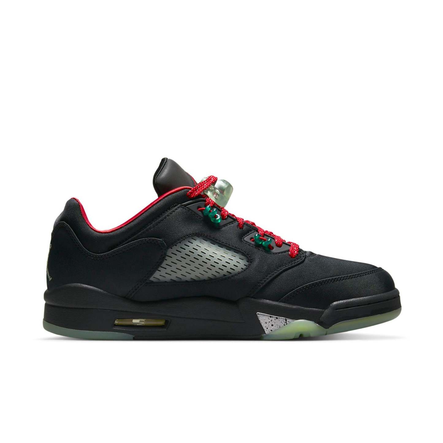 The CLOT x Air Jordan 5 Retro Low 'Jade' is a stylish sneaker with a sleek silhouette. Featuring a black suede upper, reflective tongue and a crystal-clear rubber sole, this sneaker is perfect for any activity. The inspiration behind the design is Chinese traditional jade jewelry, with red and green accents and a unique "Suzhou Code" at the heel. This sneaker is the perfect combination of modern style and Chinese culture, making it a must-have for any sneaker collection. Release date: 2022-05-13.