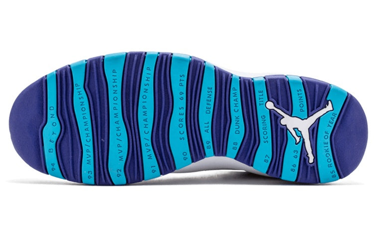 The Air Jordan 10 Retro 'Charlotte Hornets' are a must-have for any fan of the Charlotte Hornets or Michael Jordan. Released in 2016, these sneakers feature a colorway inspired by the NBA team, with an embroidered 'CHA' on the heel collar and a timeline of MJ's career on the bottom of the outsole. The 'City Pack' also includes colorways inspired by New York, Los Angeles, Chicago, London, Paris, Rio, and Shanghai- making it a truly global sneaker. Whether you're lacing up to hit the hardwood or just showing your support for your favorite team, these retro 10s are sure to turn heads.