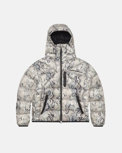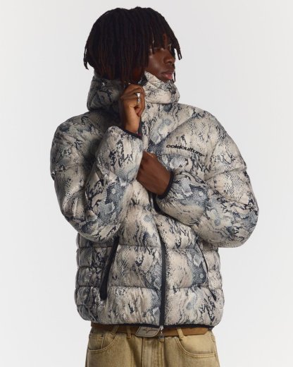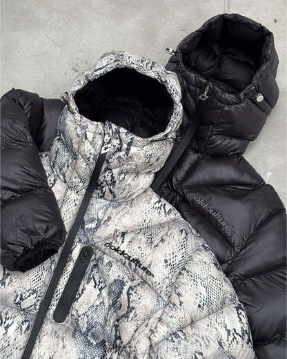 Puffer jacket with multiple panels.