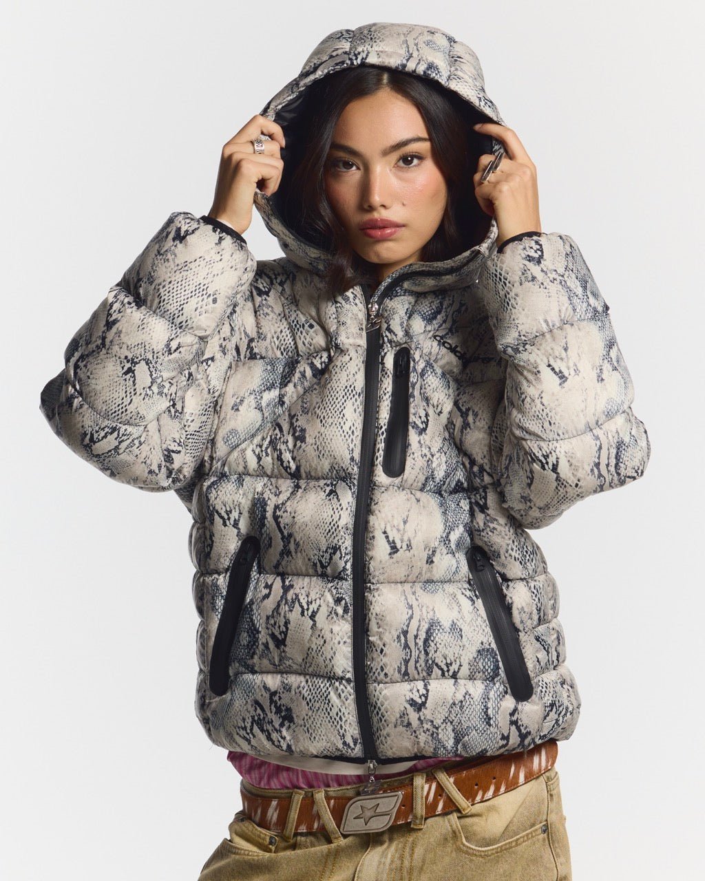 Adjustable stringed hood. Zipper pull with logo detail.