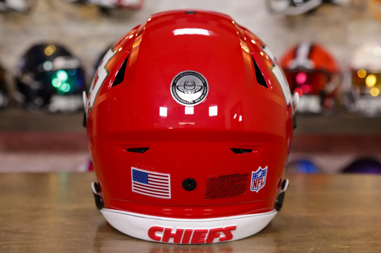 This Kansas City Chiefs Helmet is a Green Gridiron masterpiece, ready for the biggest Chiefs fan!