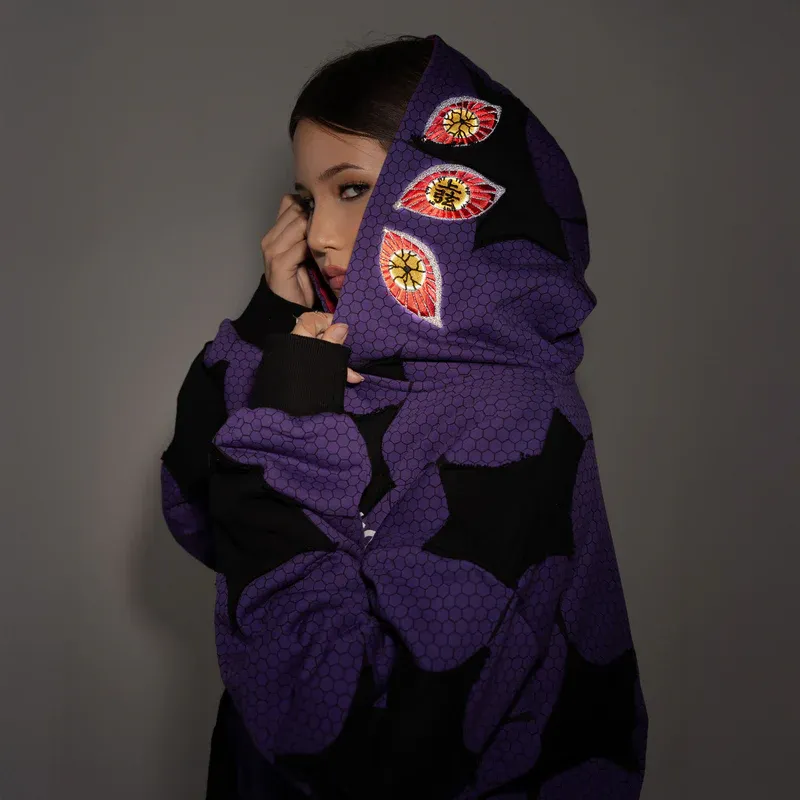 Demon eyes embroidered on hood