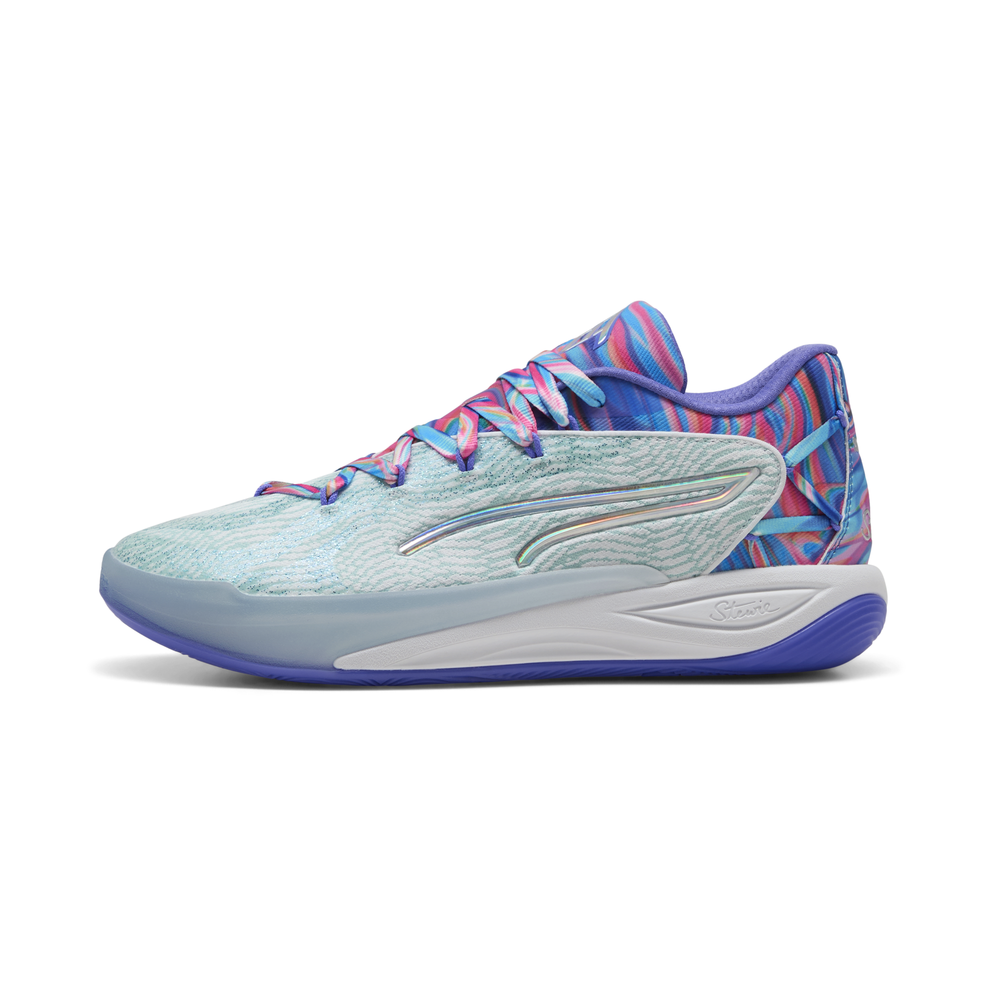 The Stewie 4 Prism Basketball Shoes draw inspiration from the infinite possibilities of light as it refracts through a prism, creating a mesmerizing spectrum of colors. This concept comes to life with iridescent and crystallized materials that adorn the Formstrip and upper mesh, delivering a striking, luminous effect. Designed for both style and performance, these shoes let you shine on and off the court.