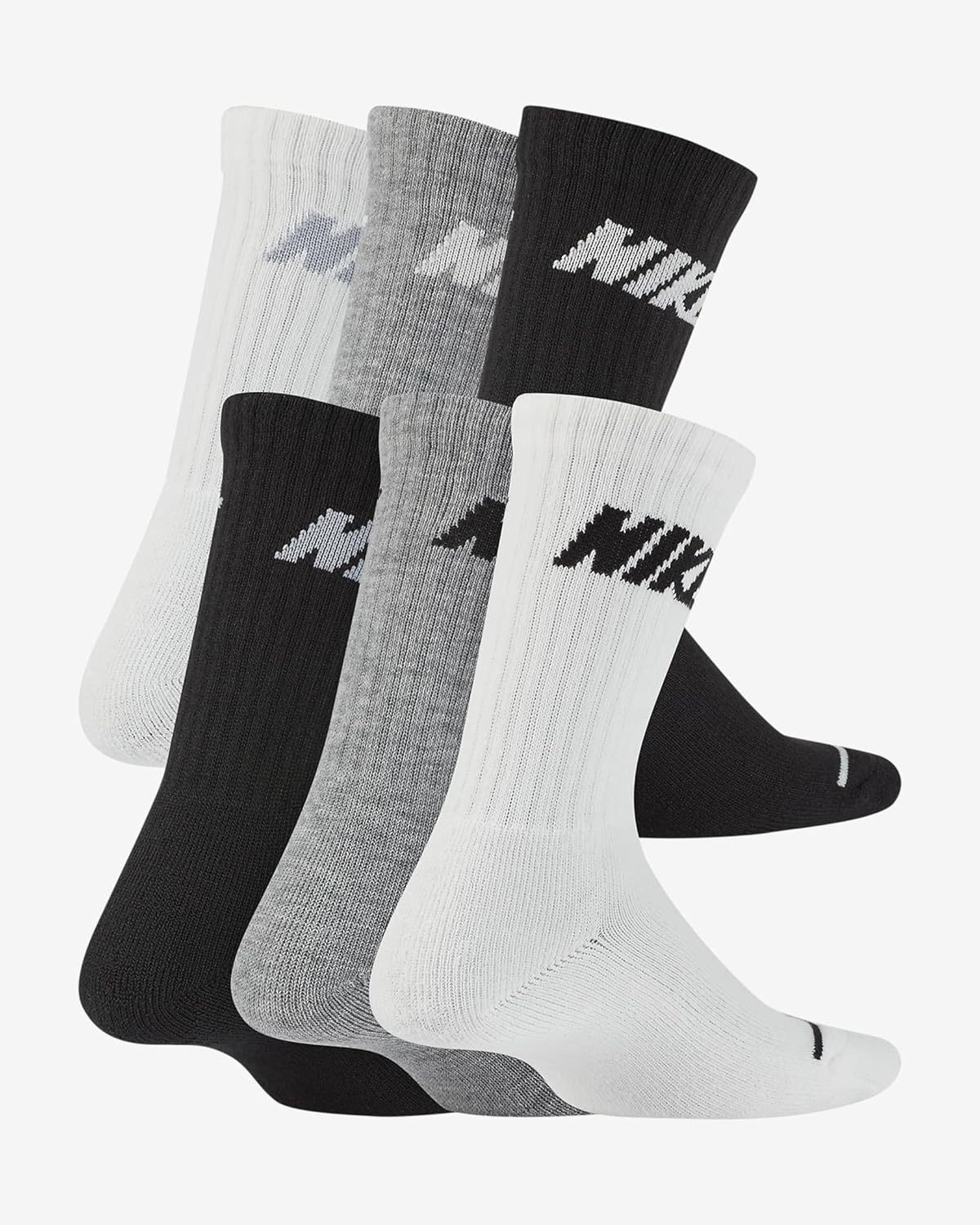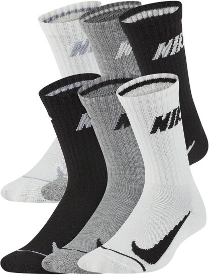 The Nike Boys Cushioned Crew Socks (6 Pack) deliver comfort, durability, and all-day wearability. Made from a soft cotton-blend fabric, these socks feature a breathable knit that helps keep feet cool, while ribbed cuffs ensure a secure fit through play or sports. With a reinforced heel and toe, they’re built to last. This six-pair pack offers dependable comfort and style for everyday use.