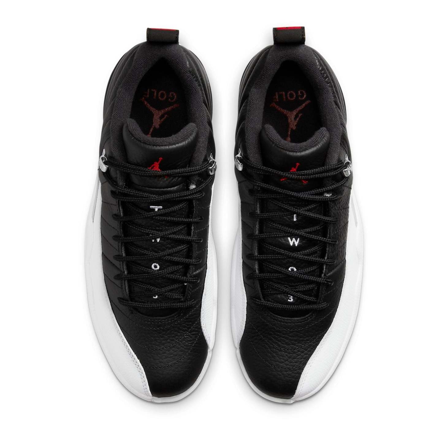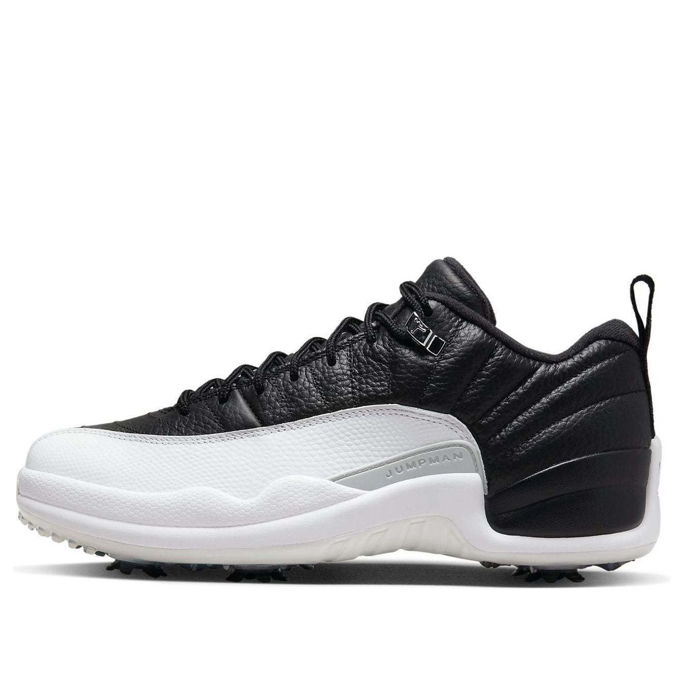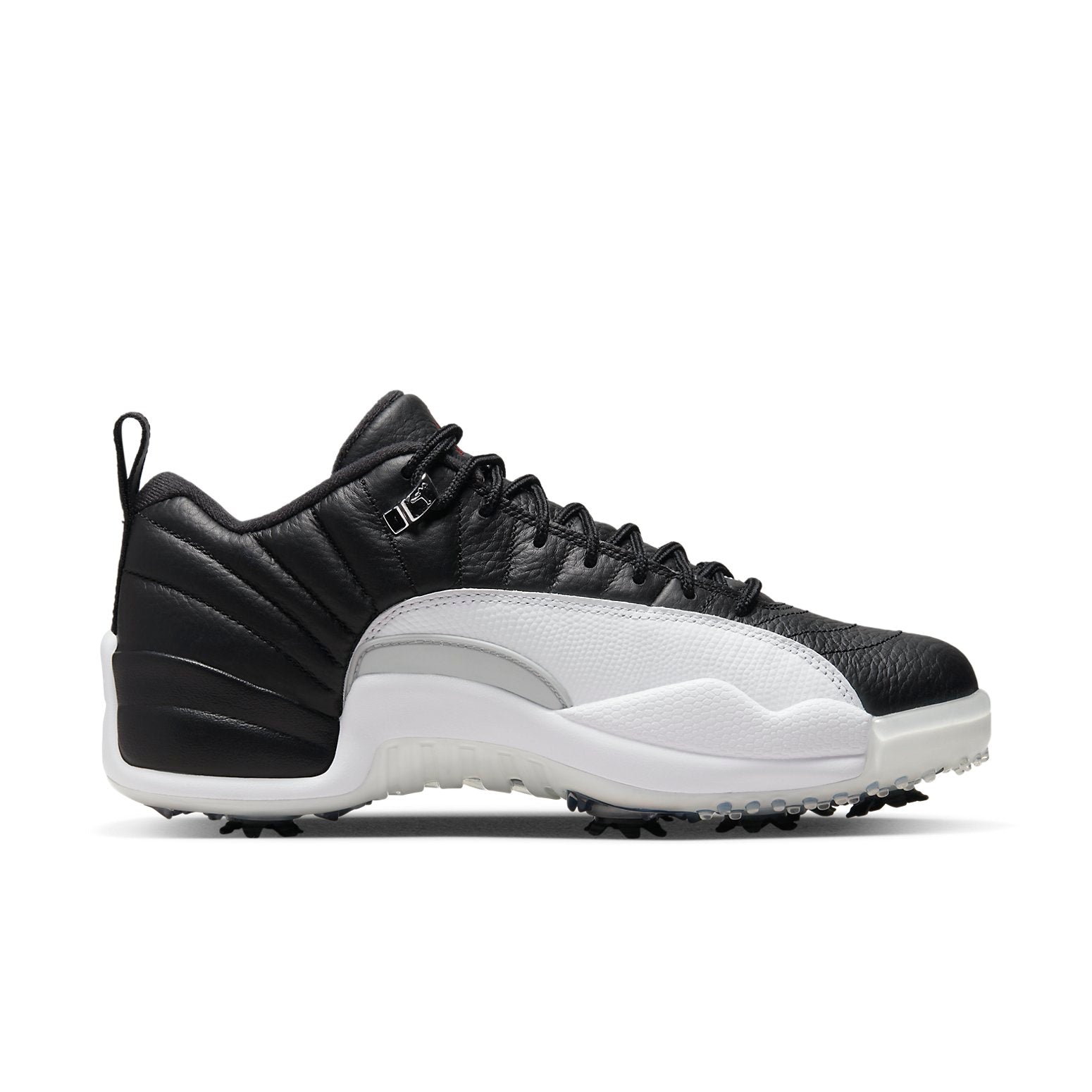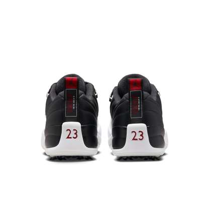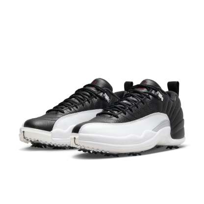 The Air Jordan 12 Low Golf 'Playoffs' is a sleek and stylish sneaker that is perfect for any occasion. Featuring a black leather upper with white overlays and red branding, this sneaker is sure to turn heads. The metal silver eyelets with spikes on the outsole complete the design. Inspired by the classic Air Jordan 12, this sneaker is part of the iconic Air Jordan series. Whether you're out for a night on the town or playing a round of golf, the Air Jordan 12 Low Golf 'Playoffs' is the perfect choice.