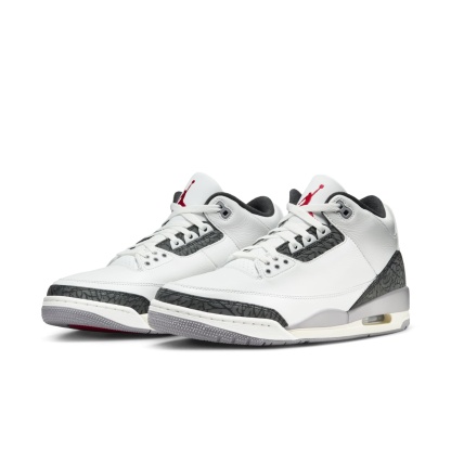 The Air Jordan 3 Retro 'Cement Grey' is a classic re-release featuring a clean white leather upper contrasted with iconic grey elephant print overlays. Pops of Fire Red on the Jumpman logo and heel tab add a vibrant touch. This timeless design, built on the innovative Air cushioning system, offers both style and comfort, making it a must-have for sneaker enthusiasts.
