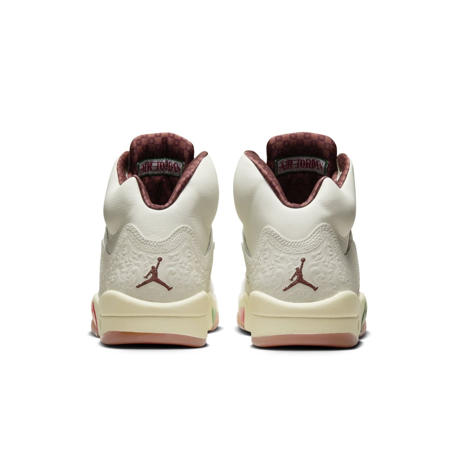 The Air Jordan 5, also known as the "El Grito," is a vibrant and eye-catching sneaker inspired by Mexican culture. The white leather upper is adorned with colorful embroidery and patterns reminiscent of traditional Mexican art. The tongue and side panels showcase striking designs, while the midsole features a mix of bright hues, including green, red, and yellow, reflecting the festive spirit of "El Grito." Equipped with the signature Air-Sole unit in the heel, the Air Jordan 5 "El Grito" provides exceptional comfort and cushioning.