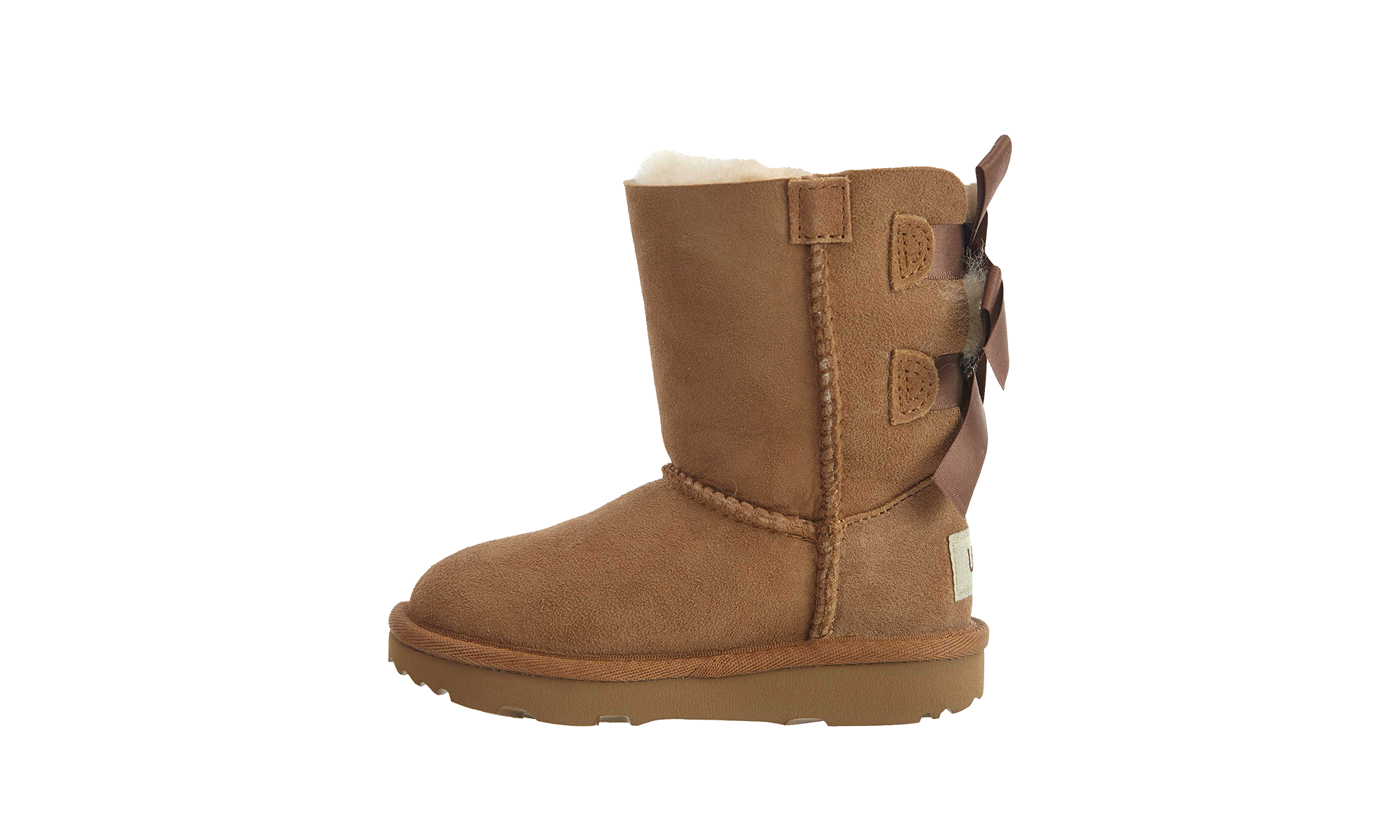 Give your toddler the sweetest style boost with the Bailey Bow II Boot 'Chestnut'. This Pre-School size features a classic chestnut suede upper, treated to repel moisture, and is adorned with two fixed satin bows on the back shaft. The plush sheepskin lining delivers signature UGG warmth, while the flexible Treadlite by UGG outsole ensures durable traction and cushioning for comfortable play all day long.