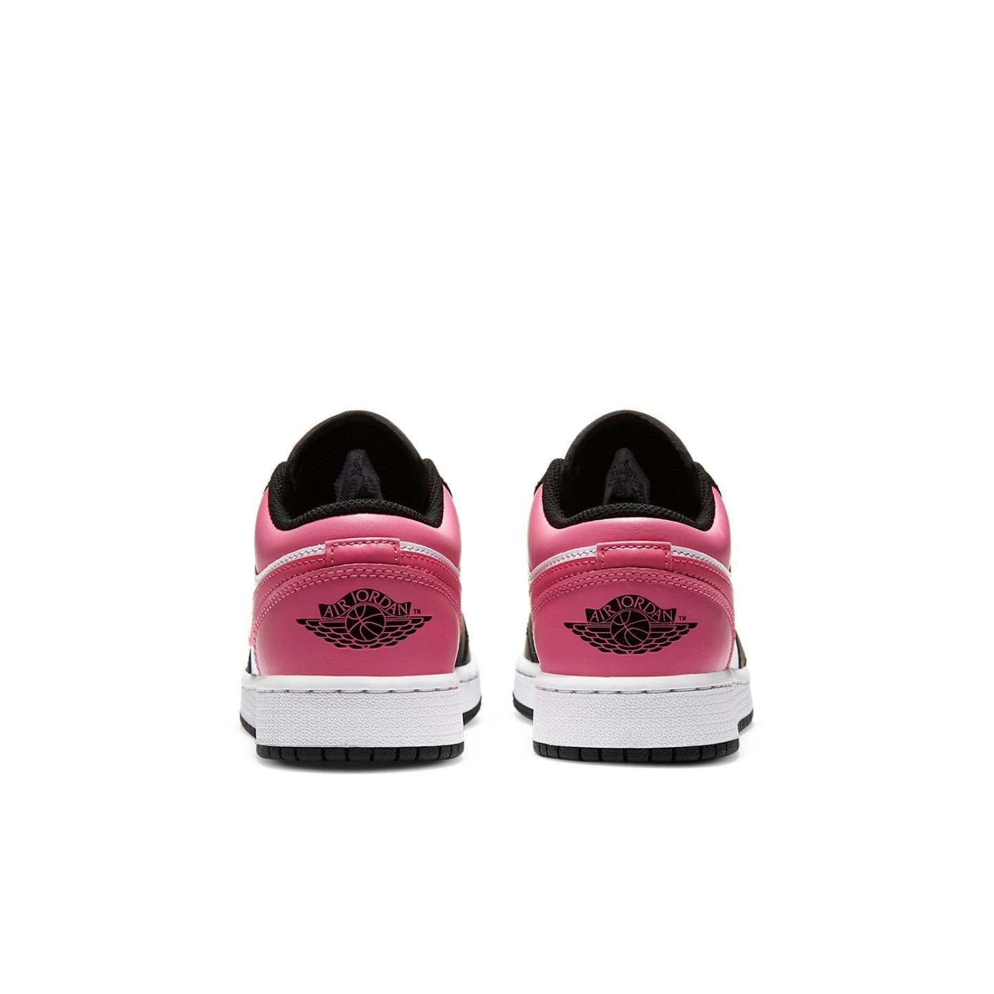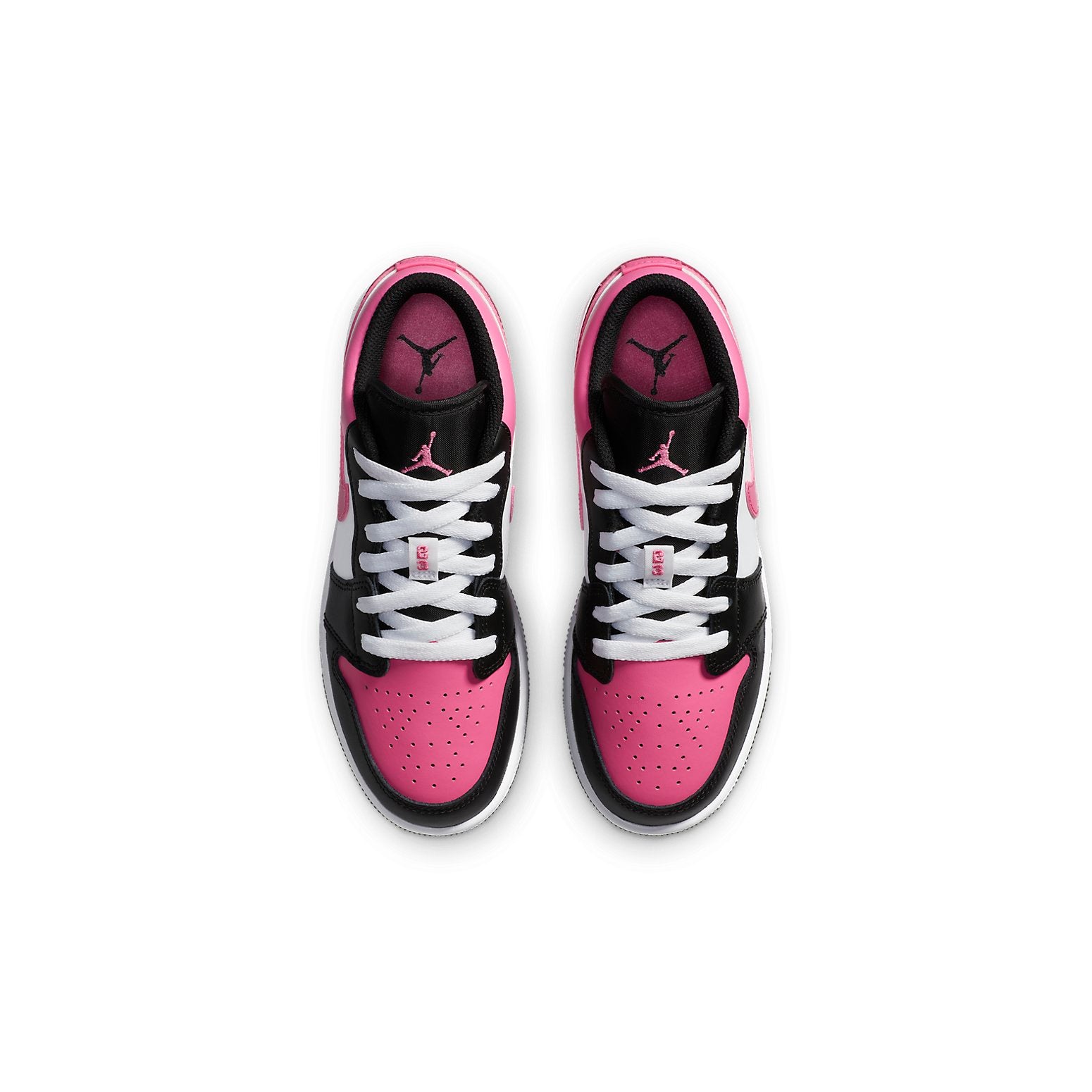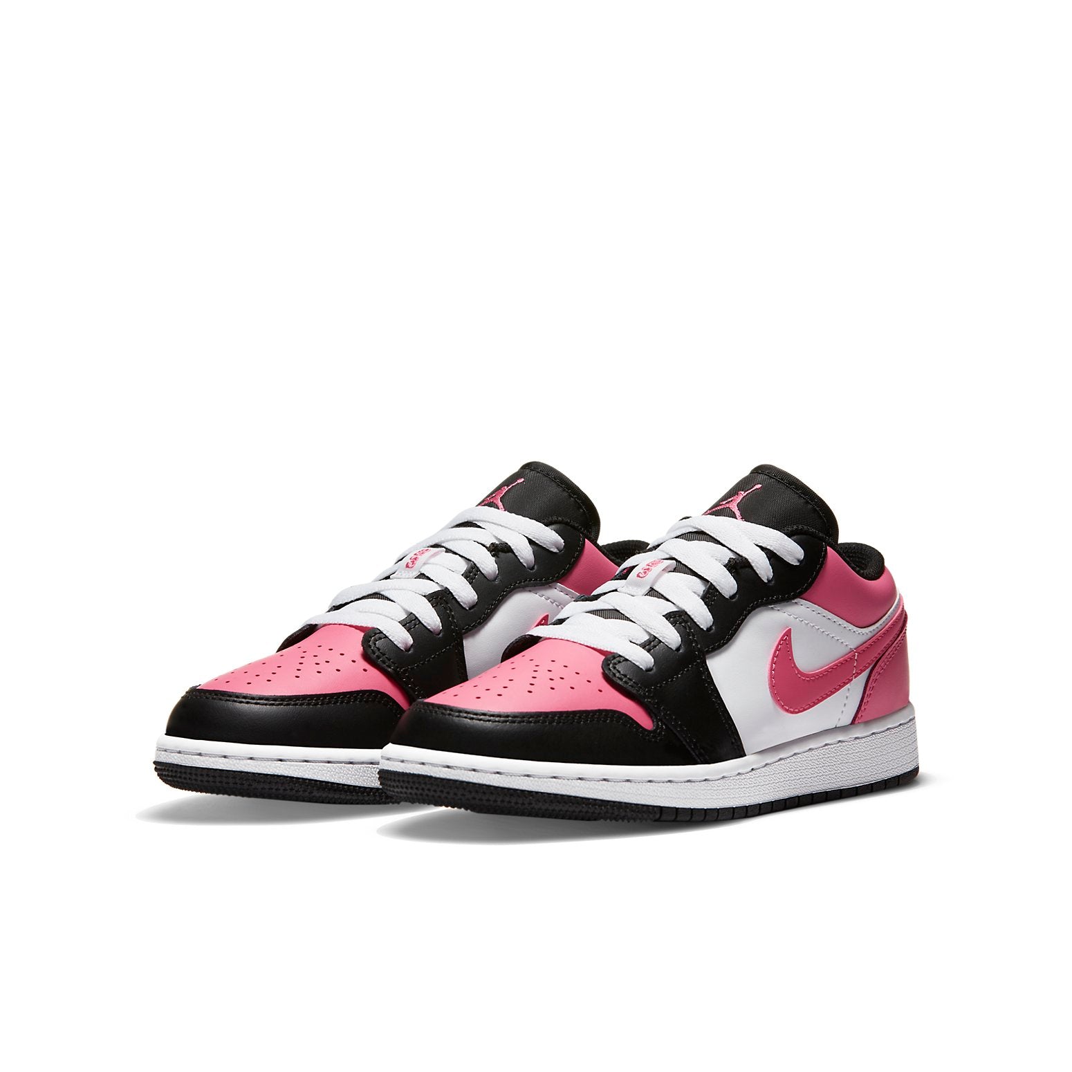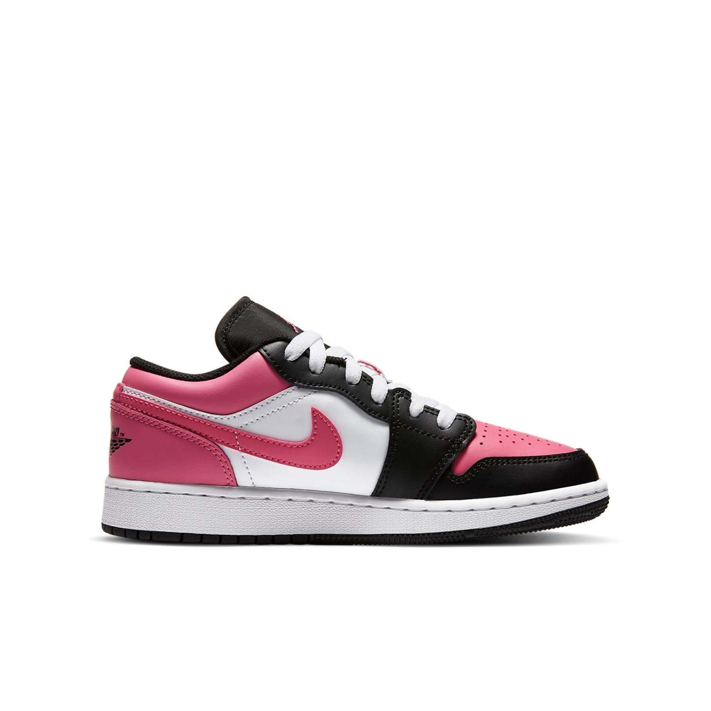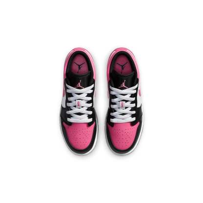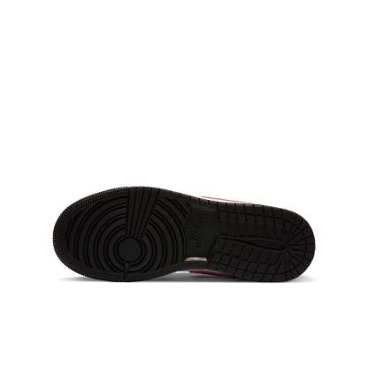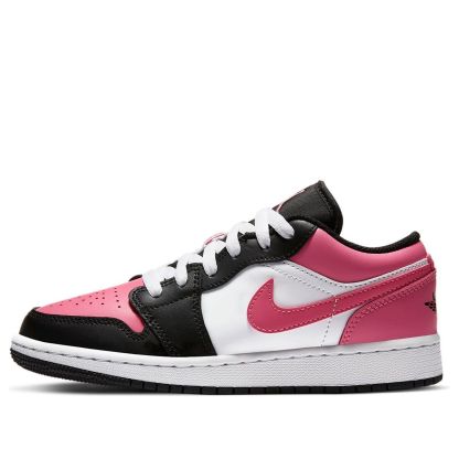 Nike WMNS Air Jordan 1 Low GS “Pinksicle” dressed in a Black, White and Pink colorway. It composed a black and white leather round of a pink upper, Swooshes and heels. The traditional wings embellishments embroidered onto the heels.