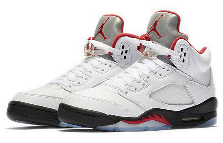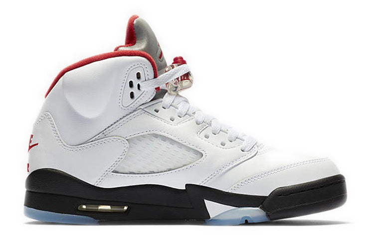 The Air Jordan 5 Retro GS ‘Fire Red’ is a must-have for any young sneakerhead. This reissue of an OG colorway is true to the original, with a white leather upper, silver reflective tongue, and Nike Air stitched on the heel. The defining feature of this shoe is the red shark tooth design inspired by the P-51 Mustang WWII fighter plane, which can be seen on the black midsole. The clear translucent rubber outsole finishes the look and provides durability.