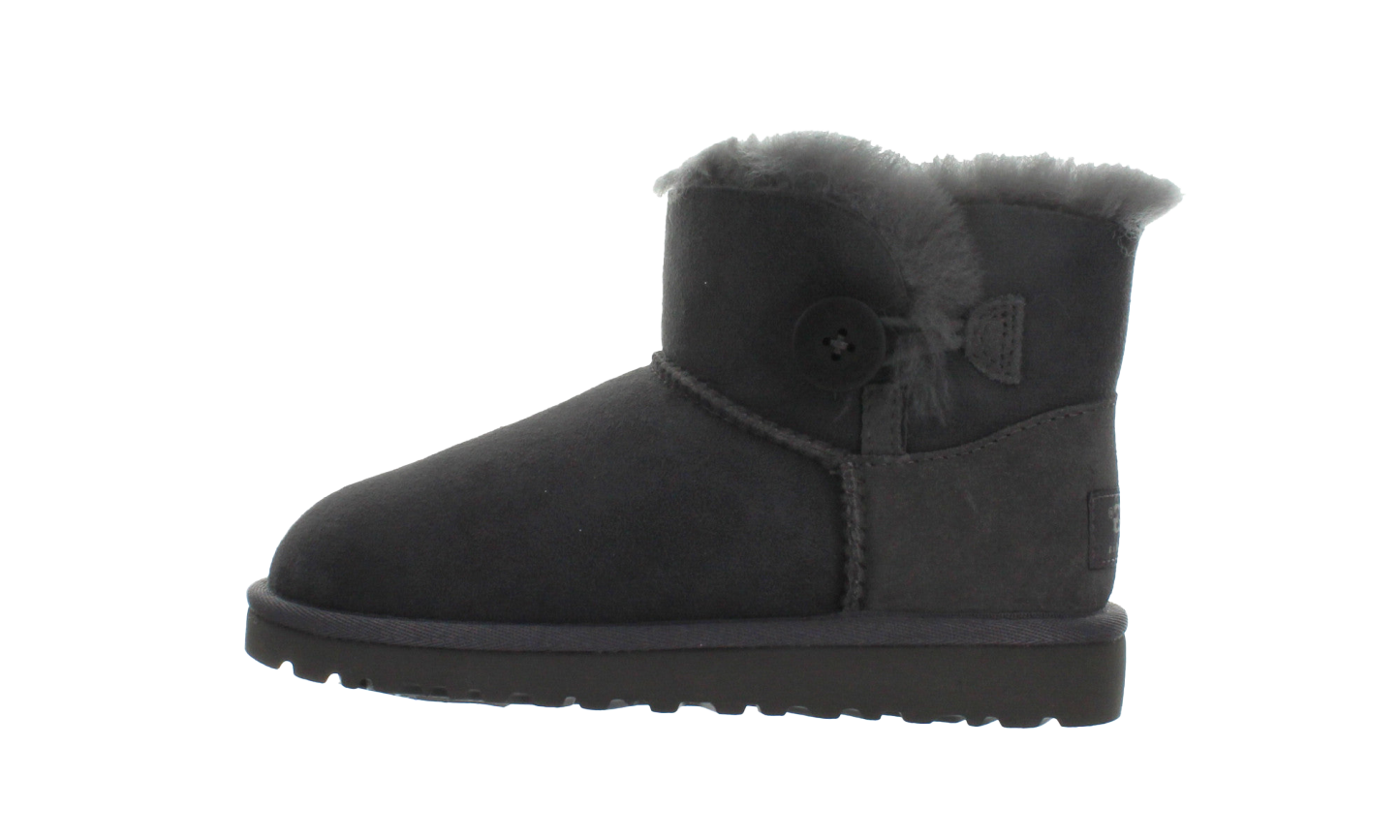 Give your Grade Schooler customizable style and comfort with the UGG Mini Bailey Button Boots GS "Grey", the classic Button-Up Mini. This popular boot features a soft Twinface sheepskin upper, pre-treated to resist light stains and moisture. The functional wood button closure allows the shaft to be worn up for warmth or cuffed down to expose the plush interior. The flexible, lightweight Treadlite by UGG™ outsole ensures enduring cushioning and traction for every playful step.