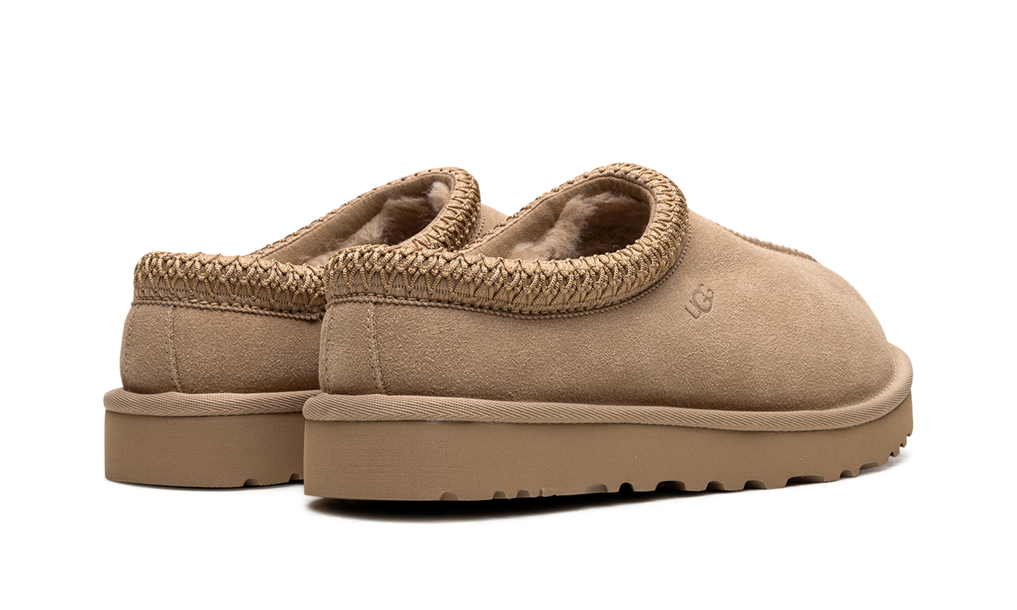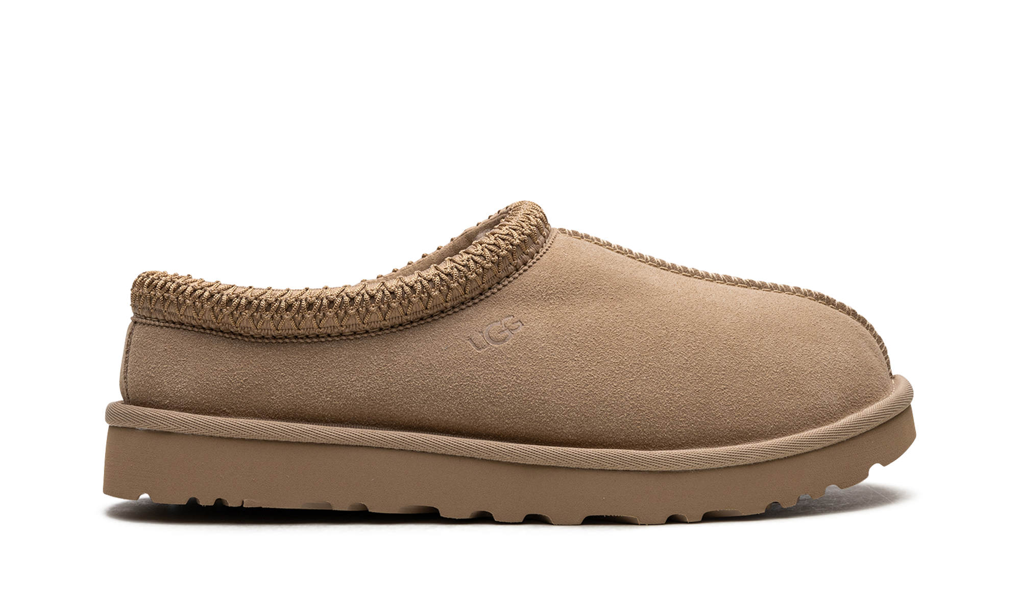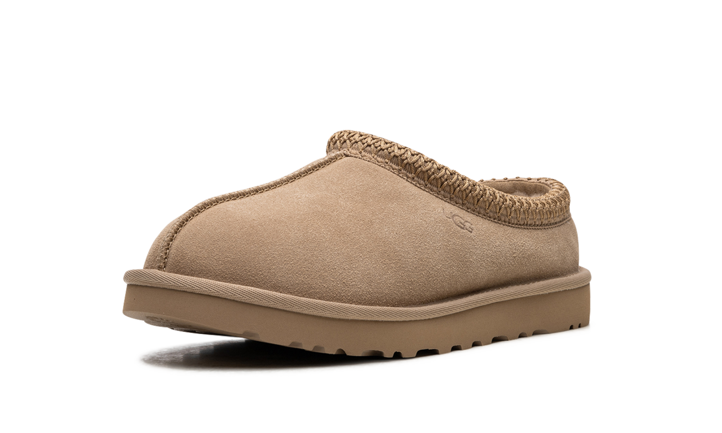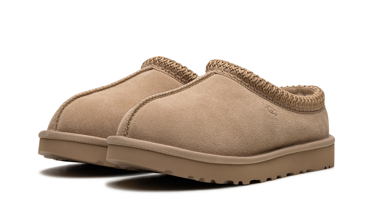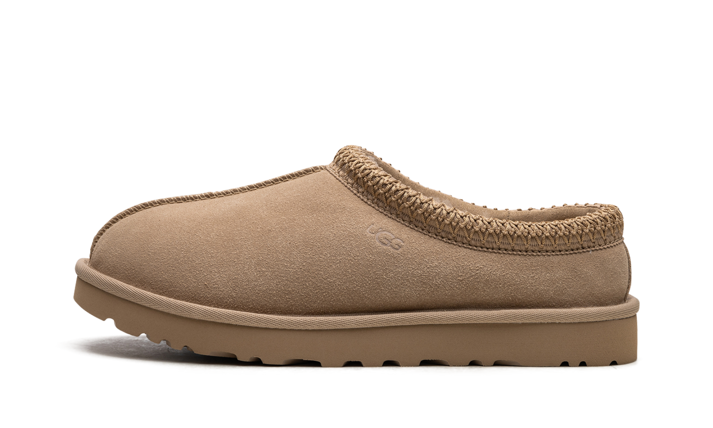 Unleash ultimate comfort with the UGG TASMAN WMNS, famed as the "Sand" slip-on moccasin. These indoor/outdoor slippers feature a classic tan suede upper and an ultra-soft lining of plush sheepskin and upcycled wool for luxurious warmth. The standout embroidered textile braid wraps the collar for added style. Finished with a durable EVA foam sole and traction pattern, the Tasman provides reliable grip for quick errands or cozy days at home.