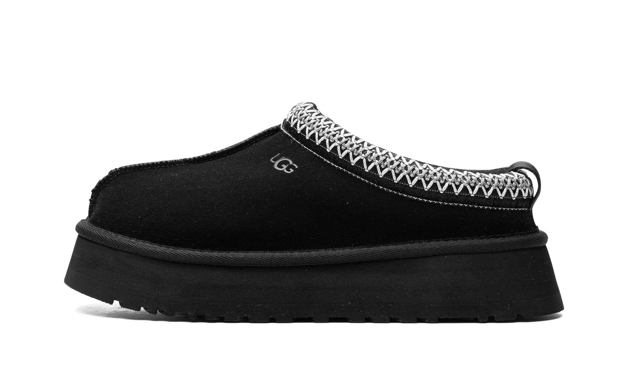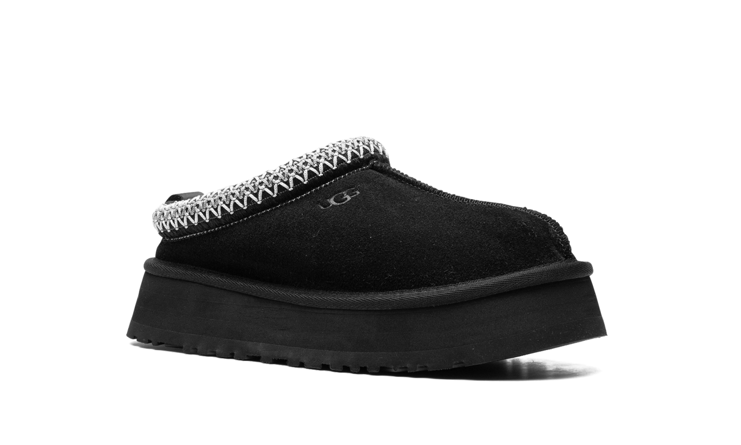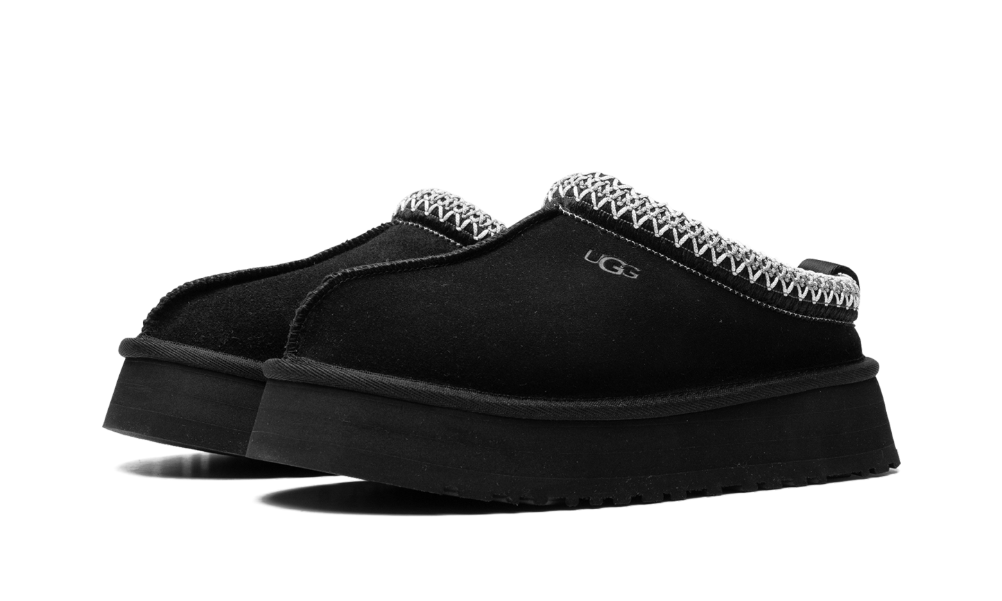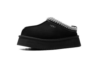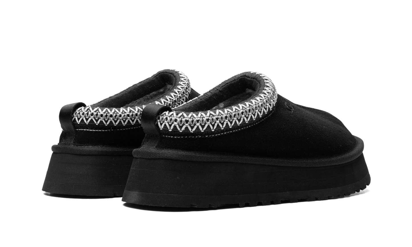 The Women’s Ugg Tazz Slipper “Black” is the the slip-on moccasin with a platform style sole in a versatile black colorway. The Ugg Tazz Slipper is made for indoor or outwear wear, and features a warm inner lining of plush sheepskin and upcycled wool. The upper features a black suede construction with an embroidered braid around the collar. Uggs branding is seen on the lateral side. The platform-style sole gives the wearer a significant boost in height, and is constructed in soft yet durable EVA foam for all-day comfort.