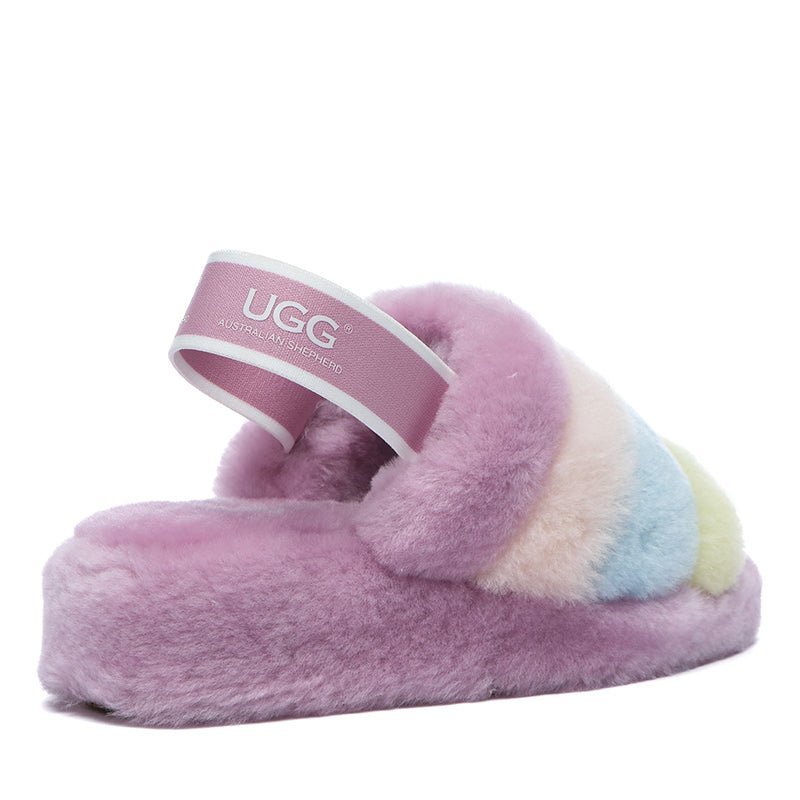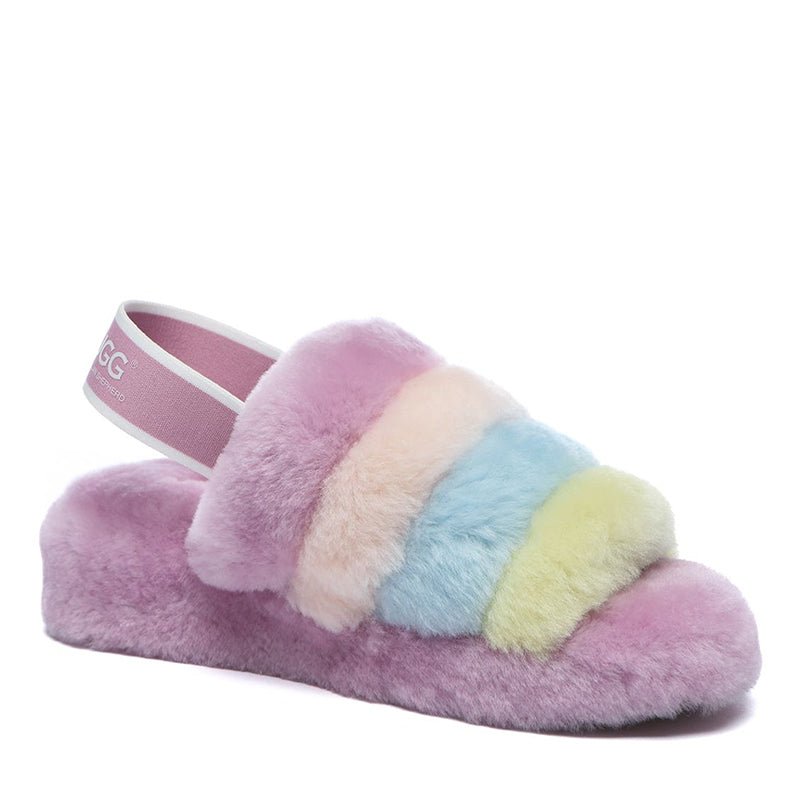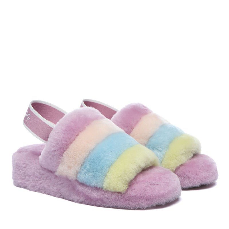 Step into comfort and style with uqdfgg Arco Iris Fluffy Slides. Soft, moisture-wicking sheepskin provides luxurious cushioning, while the nonslip rubber outsole ensures stability and flexibility. On-trend open-toe design allows you to wear them all year round, perfect for pairing with shorts, trousers, and dresses. Experience the ultimate in comfort and style.