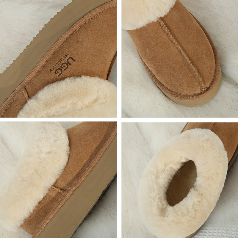 Our iconic uqdfgg Juliana Platform Slippers are made from suede upper and sheepskin lining, keeping your feet comfortable in both summer and winter due to the insulation in the material. The additional layer of the pretreated suede upper ensures water resistance.